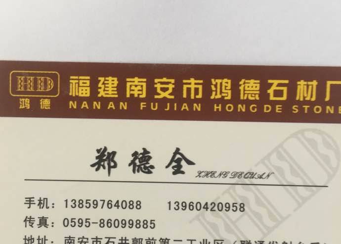 南安市石井鎮(zhèn)郭前村鴻德石材廠 聯(lián)系人:鄭德全    138****4088 查看 138****4088 查看 主營范圍: 花崗巖加工、 企業(yè)地址:福建南安石井鎮(zhèn)郭前村鴻德石材廠