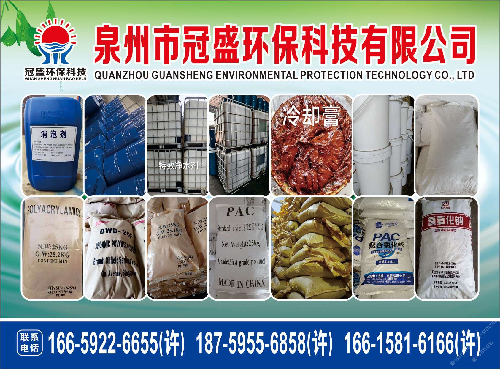 發(fā)布信息: 冠盛環(huán)??萍?6659226655 主營產(chǎn)品:凈水劑,冷卻劑,冷卻粉,大理石人造石專用凈水劑,沉淀粉,消泡劑,消毒凈水劑,防銹凈水劑,除銹劑,除臭劑,聚丙烯酰胺,聚合氯化鋁,鹵精,洗沙專用凈水劑,壓濾機專用凈水劑,陶瓷廠專用凈水劑(黃藥 白藥)等所有水處理環(huán)保材料……